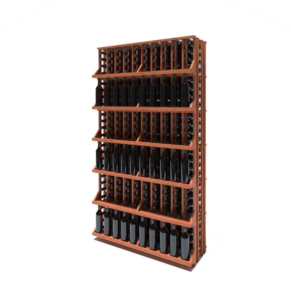 Single-sided, six shelf retail wine display. Store 4 bottles behind display bottle on each shelf