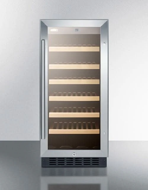 At just 14 3/4 in. wide, the SWC1535B is thoughtfully sized to store up to 33 bottles on six slide-out wooden shelves. An interior LED light provides an elegant view behind a tempered glass door, elegantly trimmed in stainless steel. The reversible door includes a factory installed lock and professional handle. Inside, the digital thermostat makes temperature management easy and intuitive, with indicator lights to show when the interior is ideal for reds, whites, and sparkling wines.